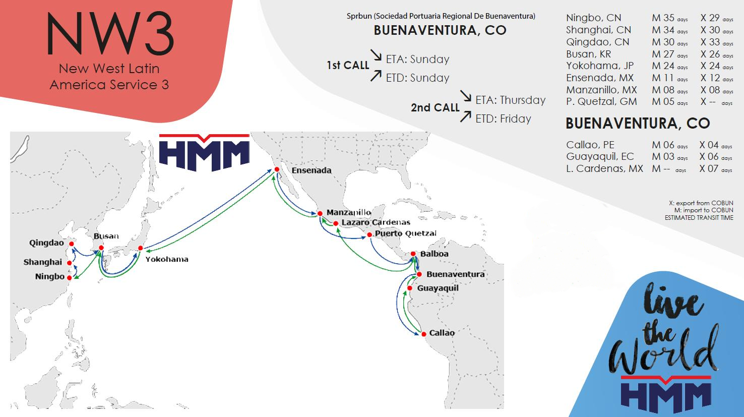 Buenaventura- Callao PE- Guayaquil EC – Buenaventura CO– Lazaro Cardenas MX – Manzanillo MX – Ensenada MX – Yokohama JP –Busan KR – Ningbo CN – Resto de Asia
